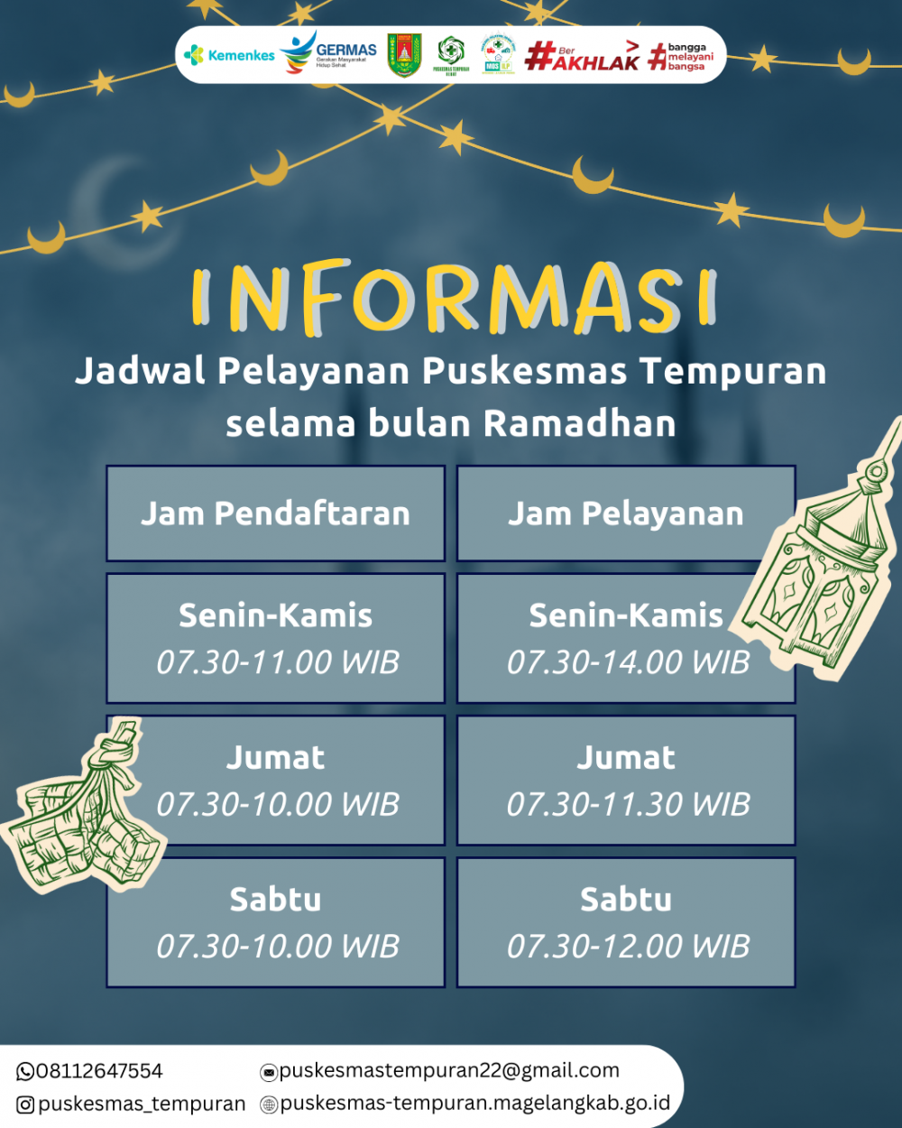 Berkaitan dengan bulan Ramadhan 2026, terdapat penyesuaian jam pelayanan rawat jalan di lingkungan Puskesmas Tempuran sebagai berikut,